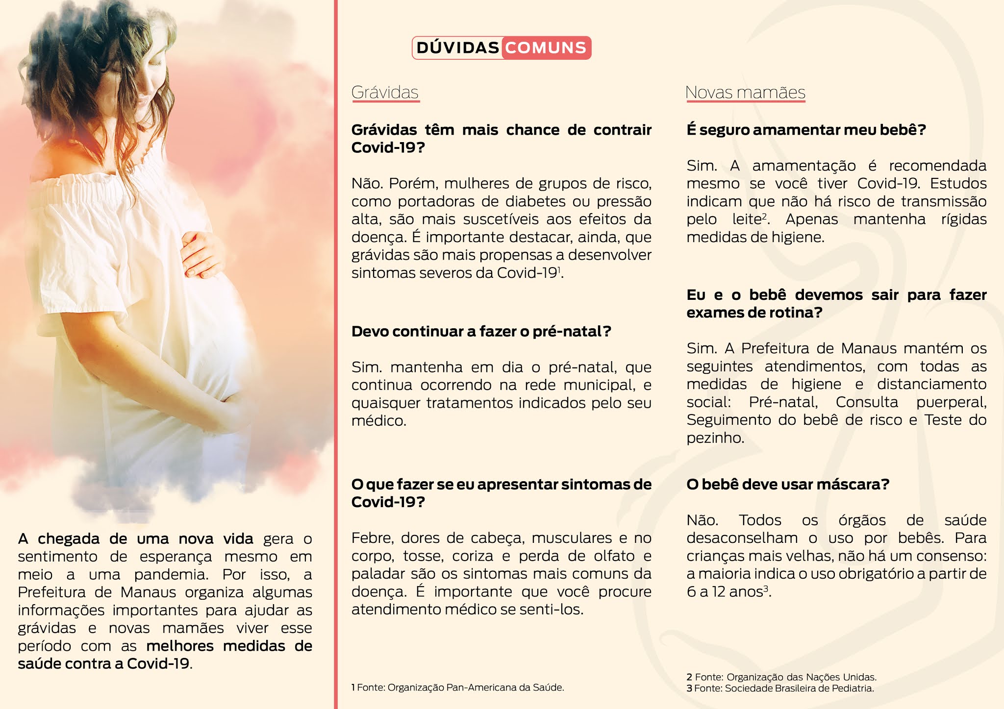A campanha Cuidar da saúde é missão de mãe foi solicitada pela Prefeitura de Manaus. Seu objetivo foi reforçar os cuidados de grávidas e puérperas durante a pandemia de Covid-19, orientando sobre as medidas essenciais a elas e aos bebês nesse período.