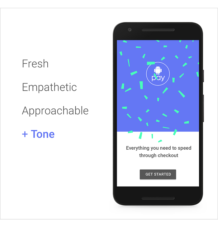 Para o Android Pay, mapeamos esses diferentes momentos na jornada da pessoa usuária. Isso foi feito em um espectro de tons variando de sério a caprichoso. Isso garante o uso da nossa voz de maneira consistente em toda a experiência do usuário.