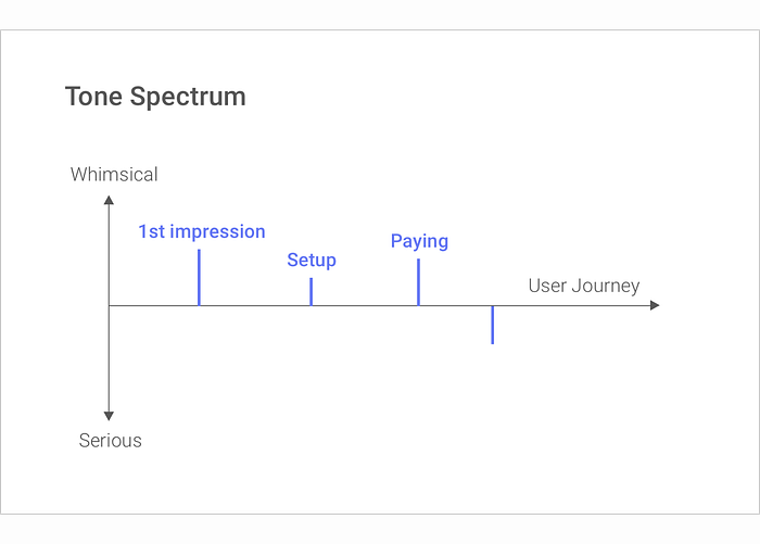Para o seu produto, as duas extremidades do espectro podem ser chamadas por outras palavras. Seu tom pode variar de informativo a inspirador ou direto a humorístico. Depois de criar suas duas extremidades, você precisa determinar quais momentos da jornada da pessoa usuária você mapeará.