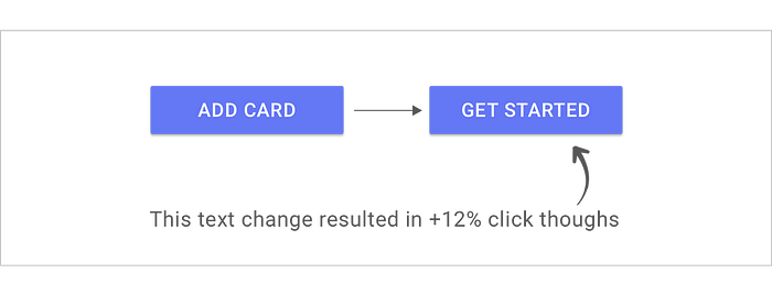 Fizemos um teste A/B na tela inicial do Android Pay. Mudamos o botão de ‘adicionar cartão’ para ‘começar’ e isso resultou em um aumento de 12% nos cliques.